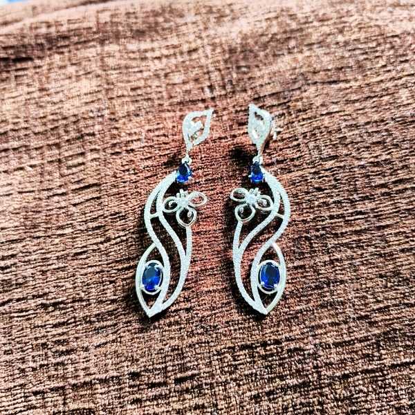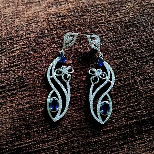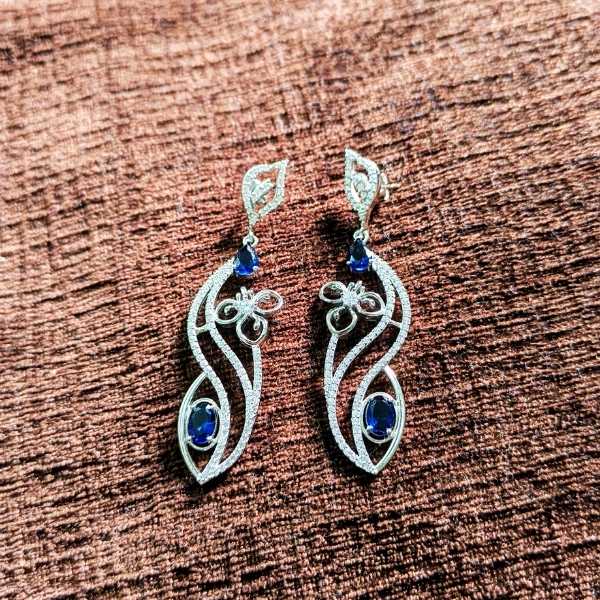Unveil elegance with the Mystic Bloom Silver Drop Earrings, featuring deep blue gemstones set in flowing silver-toned metalwork. Each earring showcases a unique floral and leaf-inspired design, adorned with shimmering accents that make them perfect for weddings, festive occasions, or statement gifting.