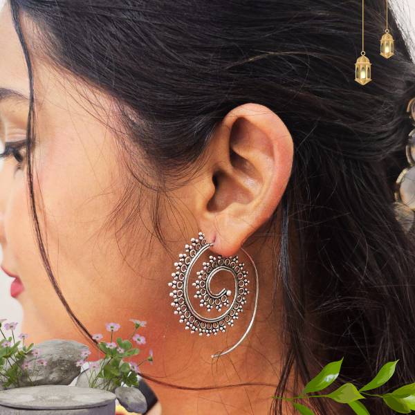 Make a graceful statement with the Chakra Bloom Sterling Silver Spiral Hoop Earrings. Crafted in pure 925 sterling silver, these earrings feature a beautifully detailed spiral design accented with delicate silver bead work, inspired by traditional chakra and floral motifs. Perfect for ethnic wear, festive occasions, and contemporary styling.