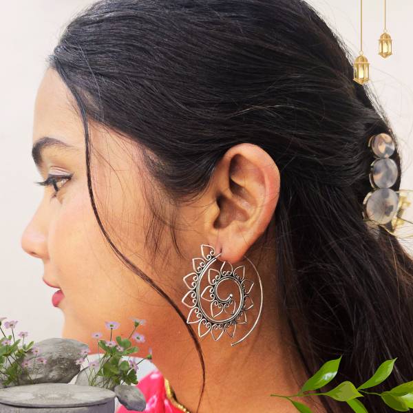 Handcrafted 925 sterling silver earrings featuring a graceful lotus-inspired spiral chakra design. Lightweight, artistic, and perfect for boho, spiritual, or ethnic styling.