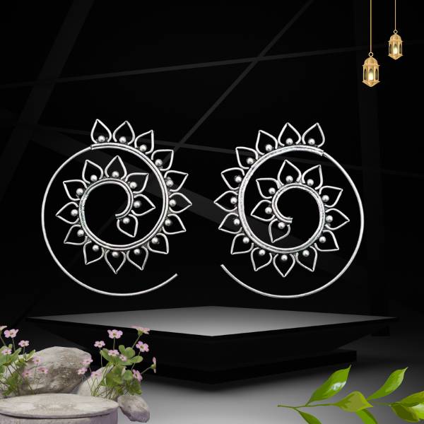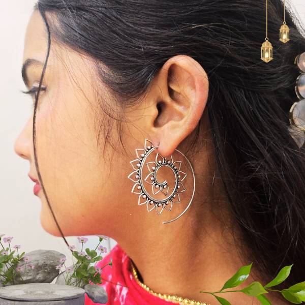 Handcrafted 925 sterling silver earrings featuring a radiant sun-lotus chakra design with smooth spiral detailing. Lightweight, artistic, and ideal for boho or ethnic styling.