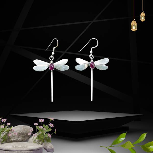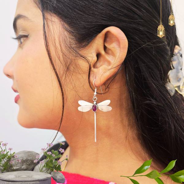 Handcrafted 925 sterling silver earrings featuring a delicate dragonfly design accented with a vibrant ruby-colored stone. Lightweight, graceful, and perfect for everyday or festive wear.