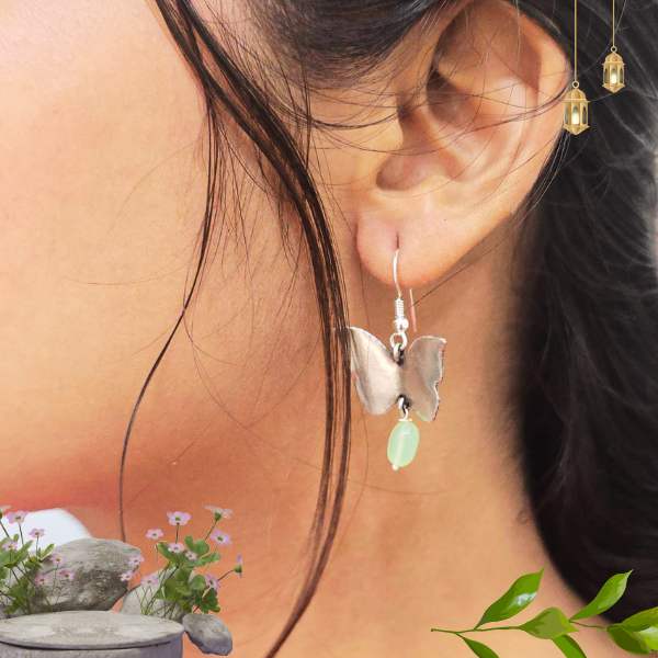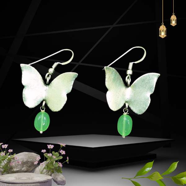 Graceful sterling silver butterfly earrings accented with a soft green drop. Lightweight, elegant, and perfect for everyday wear. Celebrate delicate beauty with these Butterfly Drop Sterling Silver Earrings. Crafted in pure sterling silver, the butterfly motif symbolizes transformation and elegance, finished with a subtle green stone drop for a fresh, natural touch. Ideal for casual outings, office wear, or thoughtful gifting.