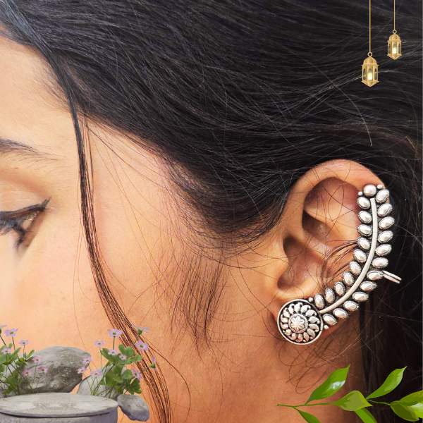Sterling silver earrings crafted with a graceful leaf curve and delicate floral detailing. Elegant, lightweight, and nature inspired.Inspired by blooming florals and flowing leaves, these Floral Leaf Sterling Silver Earrings feature a curved silhouette adorned with fine leaf accents and a floral medallion at the base. Handcrafted in sterling silver, they bring a timeless ethnic-meets-modern charm—perfect for everyday wear or festive styling.
