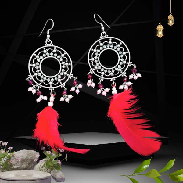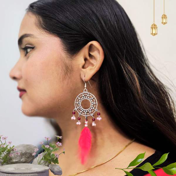 Sterling silver chakra earrings adorned with delicate beads and vibrant red feather drops. Bold, lightweight, and boho inspired.These Red Feather Chakra Sterling Silver Earrings feature an intricate circular chakra design highlighted with fine bead detailing and finished with striking red feather drops. Handcrafted in sterling silver, they bring a free-spirited boho charm—perfect for festivals, casual styling, or statement looks.