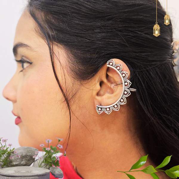 Sterling silver semi-circle earrings crafted with delicate leaf detailing. Lightweight, elegant, and modern.