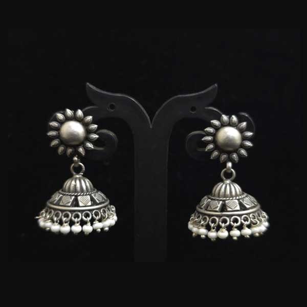 Classic 925 sterling silver jhumka earrings featuring a sunflower-inspired stud, oxidized finish, and delicate pearl drops for timeless ethnic elegance.Brighten your traditional look with Sunara Pearl Silver Jhumkas, crafted in 925 sterling silver with an antique oxidized finish. The sunflower-inspired stud adds a graceful floral touch, paired with a beautifully detailed jhumka dome and pearl danglers. Perfect for festive occasions, weddings, and everyday ethnic wear.