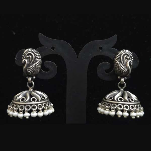Graceful 925 sterling silver jhumka earrings featuring a Mayuri (peacock) motif stud, oxidized finish, and delicate pearl drops for classic ethnic elegance.Add regal charm to your traditional look with Mayuri Pearl Silver Jhumkas, crafted in 925 sterling silver with a rich antique oxidized finish. The beautifully detailed peacock-inspired stud symbolizes grace and heritage, paired with a smooth jhumka dome and pearl danglers. Perfect for weddings, festive occasions, and timeless ethnic styling.