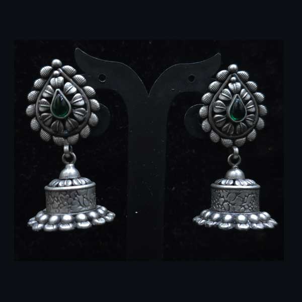 Classic 925 sterling silver oxidized jhumka earrings with floral stud design, emerald-green teardrop stone, and bold dome drop for festive traditional wear. Add timeless charm to your ethnic collection with Emerald Drop Silver Jhumkas, crafted in 925 sterling silver with a rich antique oxidized finish. The floral stud features an elegant emerald-green teardrop stone, paired with a bold handcrafted dome drop with detailed texture work. A perfect pick for weddings, festive functions, and traditional outfits.