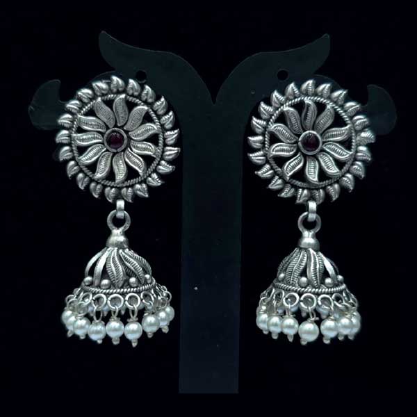 Traditional 925 sterling silver oxidised jhumki earrings with a bold floral stud design, finished with a dome drop and pearl bead hangings for a graceful ethnic look.