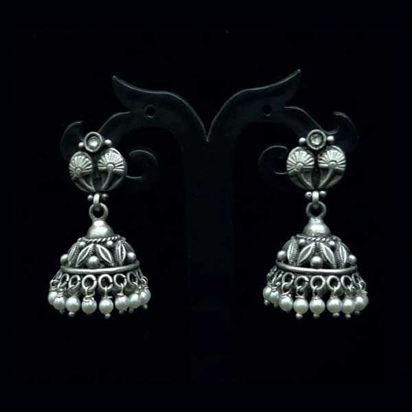 Elegant 925 sterling silver oxidised jhumki earrings featuring a lotus-inspired stud, dome detailing and pearl-style hanging drops—perfect for festive & traditional looks.