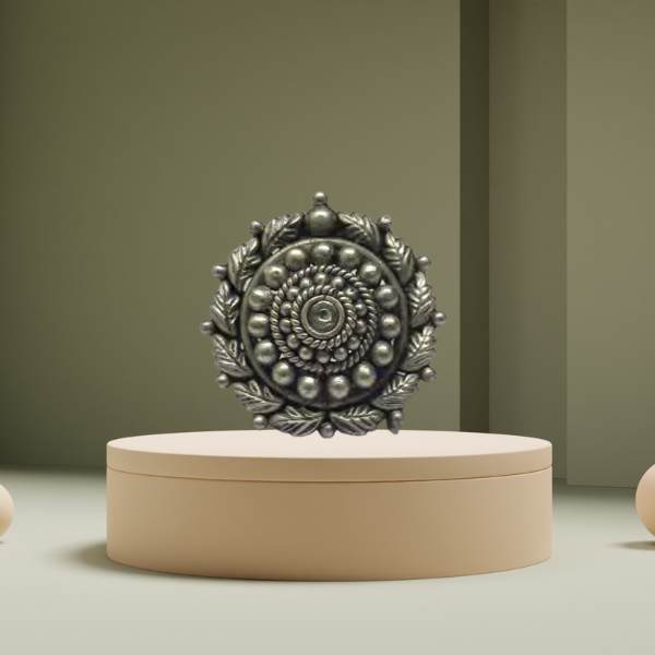 Elegant 925 sterling silver oxidised ring featuring a detailed floral-disc center with a leaf halo border, giving a bold antique tribal look for daily & festive wear.