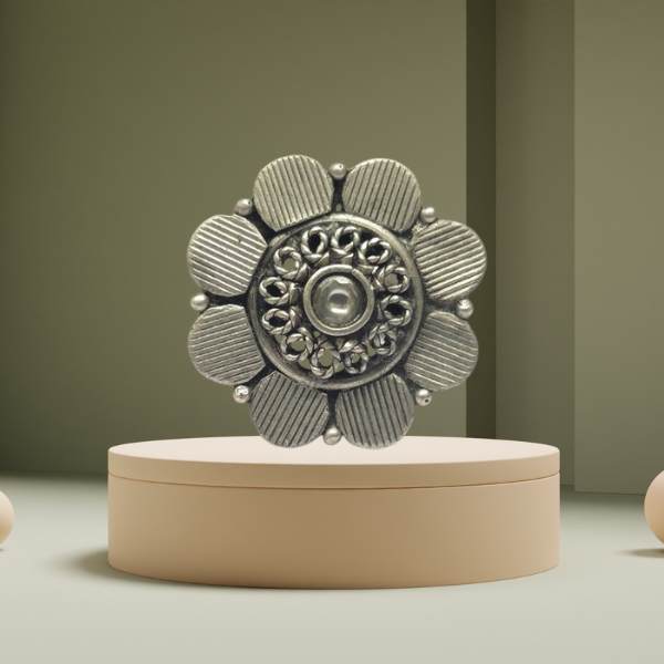 Beautiful 925 sterling silver oxidised ring crafted in a daisy flower design with a detailed raised center and textured petals for a bold ethnic look.