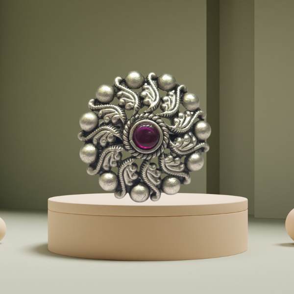 Elegant 925 oxidised sterling silver ring with paisley swirl carving, a ruby-red centre stone, and a bold beaded border for a royal ethnic look.